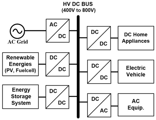 Recently, with the rapid growth of renewable energy systems and electric vehicles, research on DC distribution systems has been actively carried out due to their advantages over AC distribution systems, such as their high power conversion efficiency and lack of harmonic issues [1,2,3,4,5,6]. In addition, DC microgrids are considered to be the most viable solution for integrating renewable energy systems and energy storage systems, with DC loads such as electric vehicles and DC home appliances. Figure 1 shows a DC microgrid with DC distribution systems. To convert the high-voltage (HV) DC bus input to a low-voltage output for DC loads, an isolated DC-DC converter is required with the characteristics of low-input noise, high efficiency, and high power density. Half-bridge LLC resonant converters are popularly employed for DC loads in DC microgrids [7,8,9,10,11] because the main switches and rectifier diodes can be operated under zero-voltage switching (ZVS) and zero-current switching (ZCS) conditions over a wide input voltage range, respectively, which enables high efficiency to be achieved. For DC loads in DC microgrids with a higher DC bus voltage, three-level (TL) LLC resonant converters can be used. A fixed-frequency-controlled hybrid full-bridge (HFB) TL LLC resonant converter was introduced in [12]. All of the main switches were softly switched, and the voltage stress on each primary switch was half the input voltage. However, its efficiency was lower than that of variable-frequency-controlled LLC resonant converters. Another TL LLC resonant converter [13] was presented. Its output voltage regulation was achieved by pulse frequency modulation (PFM), which improved the efficiency of the TL LLC converter with fixed-frequency control [12]. However, to ensure that the voltage stress on each switch was maintained at half the input voltage, dead-time zones were additionally required in their driving signals, which made the driving circuits more complex. In [14], a TL double LLC (DLLC) resonant converter was proposed, which improved the complexity of the driving circuit. Moreover, it has constant high efficiency and a soft-switching ability over a wide input voltage range. However, in terms of the input-current ripple, all circuit topologies mentioned above are buck-derived topologies with a discontinuous input current, causing di/dt noise on the input side. Thus, a large input filter should be inserted, which increases the cost and degrades power density.