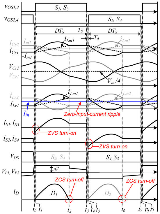 Figure 3 and Figure 4 show the key waveforms and operation modes of the proposed resonant converter, respectively. The resonant inductances (Lr1 and Lr2), transformer magnetizing inductances (Lm1 and Lm2), resonant capacitors (Cr1 and Cr2), and switch output capacitors (Coss) are assumed to be identical to each other. Since double LLC resonant tanks are connected in parallel, when one switch operates, the two LLC resonant tanks are involved in the operation at the same time. The clamp capacitors (Cc1 and Cc2) are charged with the same voltage, as Vin/2, and act as another voltage source. Prior to t0, all secondary diodes are in their off-state, and the output is separated from the primary side. Lr and Lm resonate with Cr, and iLr1 and iLr2 are equal to iLm1 = −Im1 and iLm2 = Im2, respectively, where Im1 and Im2 are the peak currents of the magnetizing inductance.