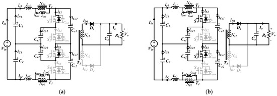 To minimize the input-current ripple, firstly, current-fed converters with a continuous input current [15,16,17,18] can be considered, but because most of them are boost topologies, they are not suitable for applications with high inputs and low outputs, unlike those with step-down buck-derived topologies. As another solution, a half-bridge converter with input-current-ripple reduction (HBC-CRR) [19] was presented. Although it is a buck-derived topology, its input-current ripple is reduced substantially by using two split windings and a clamp capacitor. However, its primary switches and secondary diodes operate under hard-switching conditions, and its secondary diodes have high-voltage stress during small-duty operation, increasing power losses. In [20], a novel high-efficiency LLC resonant converter was proposed, which improved the drawbacks of hard-switching operation and high-voltage stress on the secondary diodes in [19]. However, for higher-voltage input applications, all the primary switches suffer from high-voltage stress, resulting in high cost and poor efficiency.