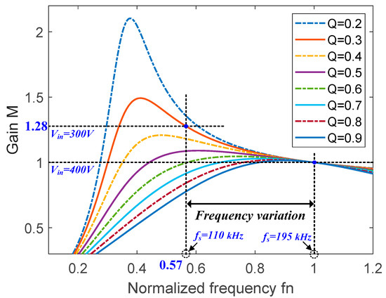 The curves of the DC voltage gain against the normalized frequency at different Q values and with Ln = 3.5 are shown in Figure 6, which is based on the experimental parameters. To ensure the ZVS operation of the proposed converter, it must be operated in the negative slope region of the voltage gain curves. The proposed converter has unity gain when the switching frequency is equal to the resonant frequency. The voltage gain increases when the switching frequency is lower than the resonant frequency. As can be seen from the graph, when the input voltage decreases from 400 V to 300 V, the switching frequency is lowered from 195 kHz (fn = 1) to 110 kHz (fn = 0.57) to achieve a voltage gain of 1.28. As a result, the output voltage is maintained at a constant voltage (48 V) without being lowered.