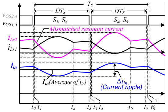 Figure 7 illustrates that the input-current ripple is caused by the difference between and when the L and C values of the resonance tanks are mismatched. In the proposed converter, if the waveforms of the resonant inductor currents iLr1 and iLr2 are the same, the input-current ripple theoretically becomes zero. To analyze the input-current ripple caused by the mismatched resonant elements, it is assumed that the two magnetizing inductances are equal, and the resonant capacitors and inductors are as follows:
