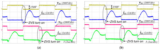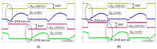 Experimental voltage and current waveforms of switches at Vin = 400 V and Io = 5 A (full load). (a) S1 and S2, (b) S3 and S4.