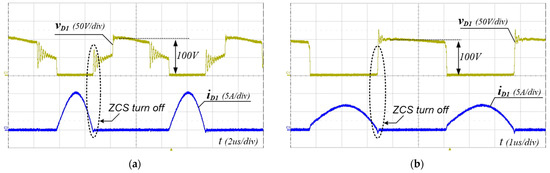 Experimental voltage and current waveforms of Diode D1 at Io = 5 A (full load). (a) Vin = 300 V, (b) Vin = 400 V.