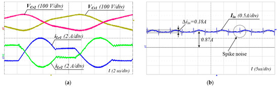 Experimental waveforms at Vin = 300 V and Io = 5 A (full load). (a) Current and voltage of the resonant tanks, (b) input-current ripple.