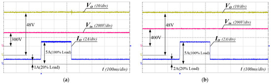 The dynamic response of the output voltage with respect to load changes. (a) Vin = 300 V, (b) Vin = 400 V.