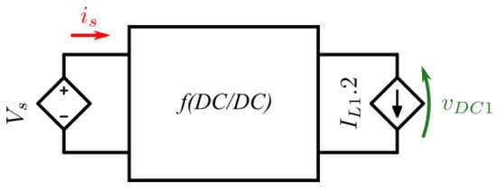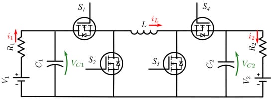 Figure 2 shows the bidirectional DC/DC converter. To achieve forward operation mode, , leaving as the buck control switch and as the boost control switch, thus allowing the use of buck mode (), boost mode(), or buck–boost mode (). The same is possible for the reverse operation mode, where , buck mode (), boost mode (), or buck–boost mode (). Carrying out the circuit analysis gives the following: