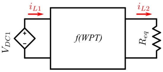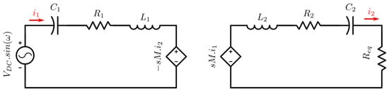 The remainder of the circuit (Figure 4) uses series-series-connected compensation for resonant operation, and an equivalent load resistance is used for the diagram. The DWPT model only requires measuring and to generate the induced voltages (shown as and ). Hence, the source and load can be connected to the full circuit without changing the DWPT.