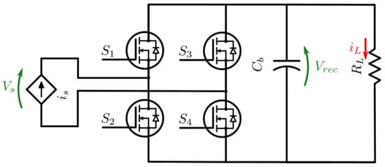 Figure 5 shows the model used for the semi-active rectifier, only switches S2 and S4 are used to control the power flow. When S2 = S4 = 0, this functions as a rectifier allowing for maximum power flow; when S2 = S4 = 1, a return path is created for the source current, effectively disconnecting the power flow.