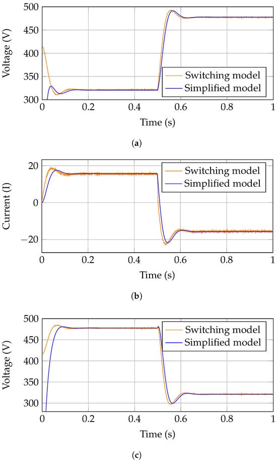 Bidirectional DC/DC converter switching from forward to reverse buck–boost mode at t = 0.5 s. (a) Voltage (Vc1) comparison. (b) Inductor current (IL) comparison. (c) Voltage (Vc2) comparison.