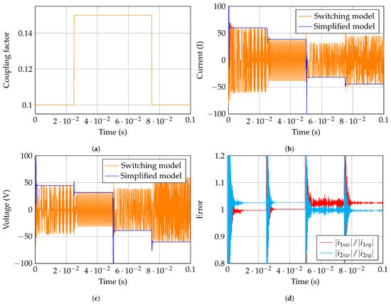 Validation of the proposed WPT equivalent circuit is shown in Figure 11 with steady state values for current amplitude at steady state note in Table 4. First, the system operation is shown at a steady state with a step change in the coupling factor. Then, the direction of power flow is reversed and the step change is reverted to show the system operating in reverse mode. Notably, the proposed system gives the peak value of primary and secondary currents, which normally remain 0; here, however, the magnitude is given as negative to indicate the direction of power flow.
