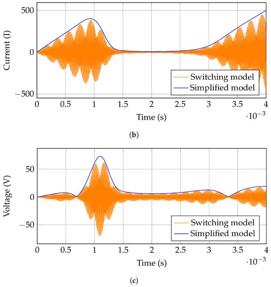 Both the switching and simplified models are provided with the same inputs, where the switching circuit shows the switching waveform at its operational frequency of 85 kHz, whereas the simplified model provides the envelope (magnitude) of this waveform. To compare the two more directly, a Fourier transform of the switching circuit is computed to obtain its magnitude; this can than be compared directly to the magnitude obtained from the simplified model. As the simplified model does not require high-frequency switching, it is able to reduce the switching model’s simulation time of 90.67 s down to 5.18 s (Table 2) for the equivalent circuit while capturing circuit dynamics.