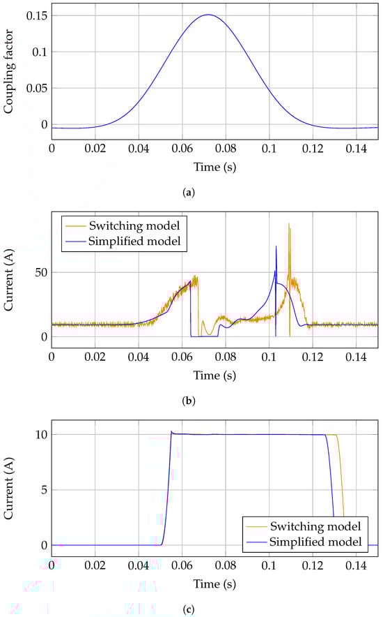Full system input and output current comparison in a dynamic scenario. (a) Coupling factor (k). (b) Source current (). (c) Output current ().