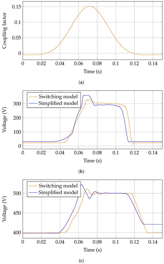 Full-system DC bus voltage comparison in a dynamic scenario. (a) Coupling factor (k). (b) Primary DC bus voltage (). (c) Secondary DC bus voltage ().