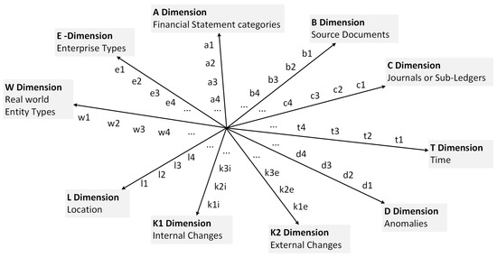 Enterprise activities-related data records are stored in the enterprise application software (EAS) databases. Company databases contain a set of files, each record of which consists of attributes linked to some real-world entities and enterprise activities. Some subset of enterprise database content are financial data linked to source documents and financial statement reports, e.g., accounts payable, accounts receivable, customers, creditors, suppliers, etc. The concept “Financial Accounting Object” (FO) meets any field name (i.e., attribute) in a file record, such as the name of a column in an Excel spreadsheet, except for time attributes. Attributes describing time values (year, month, day, …) are not considered as financial accounting objects, but are mandatory time attributes related to FO. In our approach, an abstract multidimensional space of financial accounting concepts is constructed that accommodates all FO types (associated financial data clusters or views) and financial data analysis views (external and internal factors) that can influence the behavior of the data (change in value). The financial data space (FDS) is a semantic space (Figure 1) because it consists of a set of dimensions with meaningful names that correspond to essential aspects of the accounting and analysis of financial transactions [18]. An FDS is fully characterized by a set of dimensions, with each dimension having its own hierarchy of dimension members: FDS = {A, B, C, D, E, K1, K2, L, T, W}.