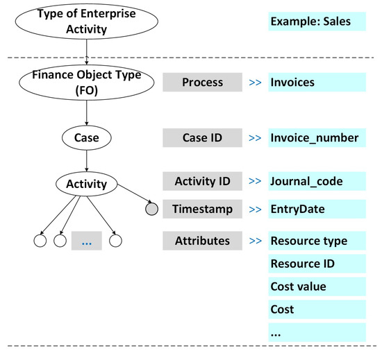 In terms of the dataset, the roll up (drill up) operation forms a subset of financial accounting data (a subset of records) that meets user requirements. The roll up (drill up) operation is based on expert knowledge, namely the financial accounting rules implemented in the code of operation. Another PM project is specified in the new FPC of a higher level of granularity by selecting Case ID, Activity ID, and Time ID relevant for the audit or financial accounting analysis.