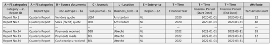The Roll Up (Drill Up) operation. In terms of dataset, the roll up (drill up) operation forms a subset of generalized financial accounting data (increases their granularity) that meets user requirements. An aggregated financial process cube is a new FPC of a higher level of granularity (without Case type dimension member a6—Section). The roll up (drill up) operation is based on expert knowledge—financial accounting rules implemented in the code of operation. Roll up operations performed in the financial data space along the hierarchy of Dimension A (FS statements: FS reports (a1), category (a2), sub-category (a3), …) are described in Table 1. In summary, using semantically easy-to-understand typical process cube operations, a financial expert can form the required subset of domains in a user-friendly style. In the next step, the PM project is specified on the received dataset (i.e., sub-cubes), as described in the article above.