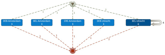 The process flow models in Figure 8 and Figure 10 are examples of different process mining views of the same event dataset. The process flow model in Figure 8 reveals a sequence of events where the tracing of the source document type (sub-journal (c2)) is more important than the location (Business_unit (l4)). The view of the process flow model in Figure 10 is different, where the tracing of location (business_unit (l4) is more important than the source document type (sub-journal (c2)). Different process models (dependency graphs and process flow models) can be obtained from the same raw dataset when a different process mining view is defined, i.e., different Case IDs and Activity IDs are specified in the PM project specification. Using Composite IDs (Case ID and Activity ID), it is possible to create Case IDs and Activity IDs as combinations of several different FO values (FO(1), FO(2), FO(3), …, FO(n)) and retrieve their causal dependencies (process models), make different combinations, and obtain different dependence maps (different process models). Such an analytical capability reveals hidden causal dependencies between different FOs and required combinations of FOs. This is a novel technological basis for conducting audits, as it is possible to investigate very complex dependencies between FOs using PM tools online. One of the promising directions of the application of this method is the detection of anomalies in financial data and their behavior assessment, using behavioral change indicators [34]. This task has new opportunities when applying PM and examining dependency graphs, process flow models, and statistical indicators.