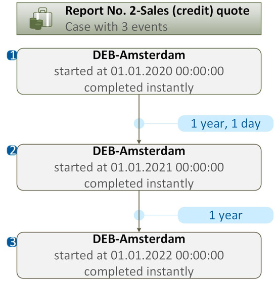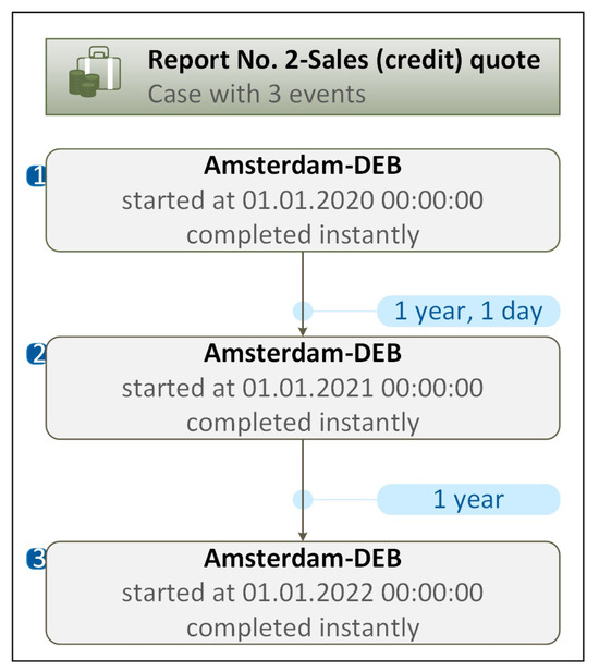 An example of the trace (process flow) generated by the PM tool for Case ID (Report No.2, Sales (credit)) quote) is presented in Figure 10.