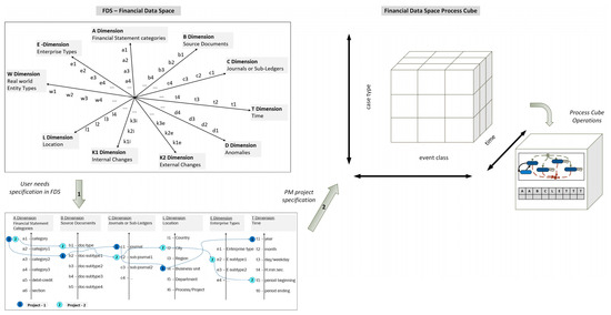 In this case, financial process cube dimensions are related to FDS axes: vertical dimension Case type = FS categories; horizontal dimension Event class = source documents; and diagonal dimension Time window = year. The financial process cube is defined as follows: FPC = (Case type = A dimension: FS categories), Event class = B dimension: source documents), and Time window = T dimension: financial period). All other axes of the financial data space are not shown because these axes are not included as mandatory PM Project-1 parameters Case ID and Event ID; they only play the role of other attributes in the event log entries. In the next step, PM project specification must be declared, indicating three attributes of the event record as mandatory identifiers (Case ID, Event ID, and Timestamp). Other attributes of the same event record are optional elements of the PM specification, i.e., extra information, for example, including resources, people, or data elements recorded with the event. However, it is necessary to prepare financial data for every cell in the process cube and create an event log and specify the PM task (project) with the parameters Case ID, Activity ID, and Time ID [3,36]. Thus, an event log can be seen as a list of cases (a multiset of traces), and each case can be seen as a sequence of activities laid out on the axis of time. There is sample process mining demonstrated by Project-1 and Project-2 specifications (see Figure 3) in the relevant process cube environment. In general, the PM project specification is defined as follows: PM-project = {Case ID, Activity ID, Timestamp, Attributes (a1-ID, a2-ID, …, a99-ID, …)}. The defined financial process cube includes only required FDS axes out of the available ones. The specification of Project-1 in the FDS (Figure 3) is transformed to the specification of process mining Project-1 in the financial process cube as follows: