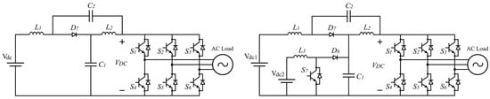 The regular power electronic topology of the unidirectional voltage-fed quasi-Z-source inverter with a (left) single-voltage source; (right) dual-voltage source.