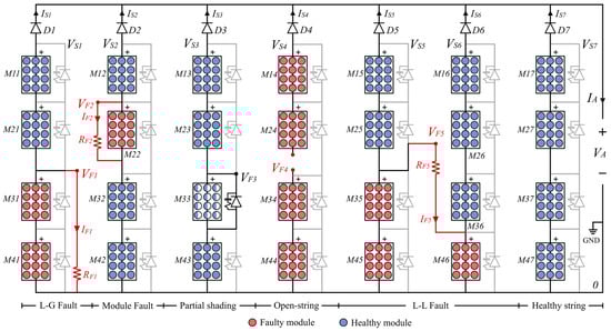 A 4 × 7 PV array experiencing different types of faults within each individual string.