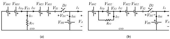 Line-to-ground failures in PV arrays, as seen in Figure 2, resemble short circuits that occur between the ground and one or more active conductors. This fault event can be modeled by the equivalent circuit shown in Figure 3a. As long as the voltage at the array terminal is lower than VS1, the current in the faulty string will continue to flow because the diode D1 is conducting. The diode D1 becomes reverse biased when the voltage (VA) of the array reaches or exceeds the level of the troublesome string. The behavior of the faulty string during L–G faults is directly affected by the fault resistance (RF1). As the voltage drop across RF1 increases, a higher terminal voltage of the array is required to reverse bias diode D1. Therefore, the extent to which the output power is diminished is determined by the number of faulty strings. Since the array terminal voltage remains unaffected by the fault event, as the healthy strings maintain its voltage levels the reduction in power occurs in the form of a current decrease, caused by the absence of the faulty string’s current. Therefore, the PV array current (IA) is only influenced when the series diode is not conducting, which happens when the voltage across the diode is lower than its forward voltage. As a result, under an L–G fault condition, the array current can be modeled as a function of the voltage across the series blocking diode of the affected string (VD1) and the panel open-circuit voltage (VOC) as follows: