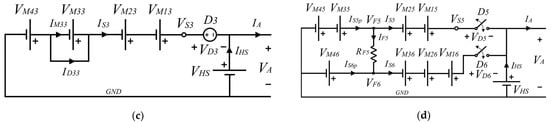 The array’s performance during an L–L failure is affected by two faulty strings, as shown in Figure 2. The incidence of failure can be depicted by the analogous circuit displayed in Figure 3d. If the voltage at the array terminal remains below VS5, the malfunctioning string will operate as if it were a normal string. Diode D5 experiences reverse biasing when the voltage (VA) of the array reaches or exceeds the level of the troublesome string. Therefore, the number of faulty strings determines the extent of the output power decrease. As the array terminal voltage remains unaffected by the fault event, the current IA is only influenced when the series diode is not conducting, which happens when the voltage across the diode is lower than its forward voltage. As a result, under an L–L fault condition, the array current can be modeled as a function of the voltage across the series blocking diode of the affected string (VD5) and VOC as follows: