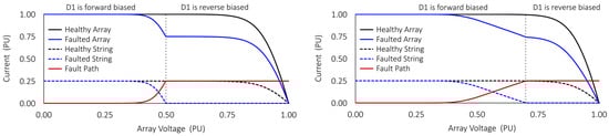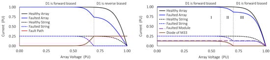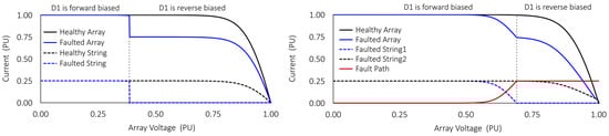I–V characteristic of a 4 × 4 PV array under a (left) module fault condition; (right) 50% partial shading case scenario.