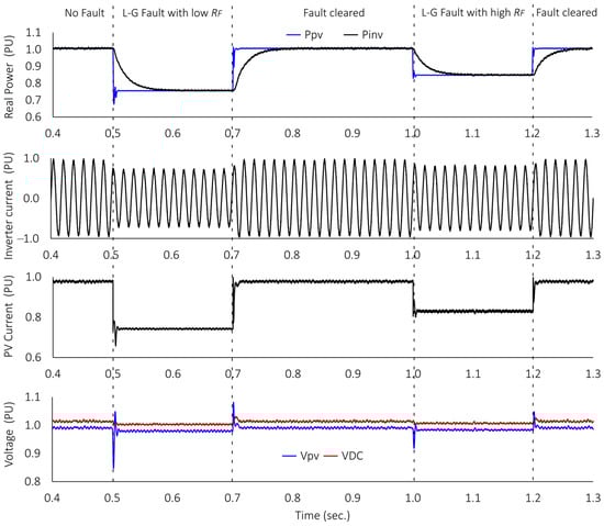 Behaviors of the PV and inverter powers, AC current, PV current, and PV and DC bus voltages in response to an L–G fault disturbance at the MPPT level for a 4 × 4 PV array.