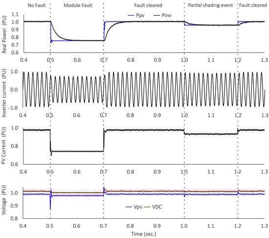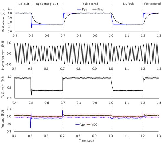 Similarly, the transient performance of the proposed converter was evaluated during partial shading, open-string faults, and L–L faults with zero fault path impedance, as illustrated in Figure 23. In the partial shading scenario, shading was applied to module M31, while the open-string fault occurred between modules M31 and M41. The L–L fault was introduced between string 1 and string 2. The results reveal that during the partial shading event, the PV power output decreased to 0.8 PU due to a reduction in the string current. In the case of open-string and L–L faults, the power output dropped to 75% of its maximum rating, which is expected since one of the four array strings was open-circuited during these faults.