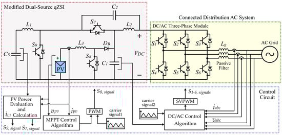 As observable in Figure 11, the converter is composed of three capacitors (C1, C2, CS) and two inductors (L1, L2). The PV array was interfaced with a DC–DC boost converter, with the power switch S8, diode DB, and inductor L3, due to the need for boosting up the PV voltage for MPPT control and to meet the AC grid voltage magnitude. This converter is chosen to be a unidirectional power converter where the PV current cannot flow in the opposite direction. Moreover, the PV boost converter is deliberately positioned across capacitor C1 to ensure a rapid control response of the DC-link voltage, where the average value of VDC is equal to VC1. The capacitor CS is integrated into the VF-qZSI network to serve as auxiliary energy storage, which is designed to supply or store the transient energy based on the transient behavior of the PV power. Switch S7 is employed to facilitate bidirectional power flow, whereas switch S9 is positioned to direct the energy stored in CS toward capacitor C1 during power regeneration scenarios.