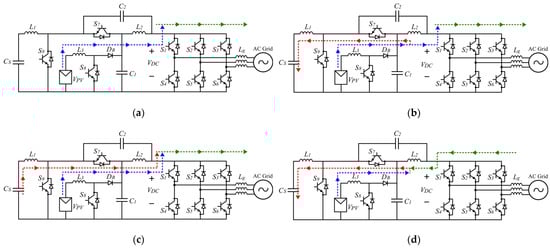 Each operational mode is engaged depending only on the behavior of the PV array. The goal is to preserve the reliability, high quality, and desirable security of the PV-injected power. Figure 12 illustrates the active power flow between the PV system (blue arrow), the capacitor CS (red arrow), and the connected AC grid (green arrow), encompassing all modes with the existence of the PV and AC grid power (mode 1, mode 2, mode 3, and mode 4).