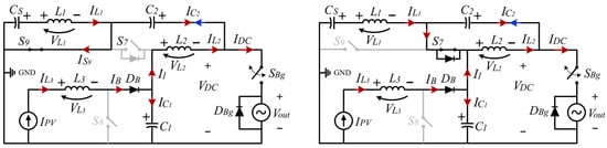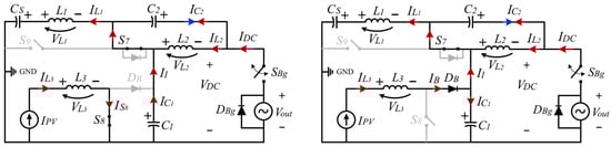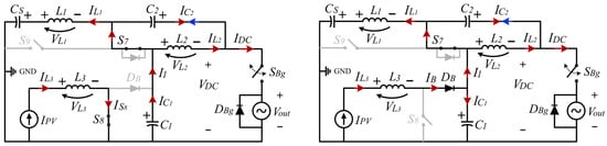 Equivalent circuit of the modified dual-source VF-qZSI during mode 2 and the (left) charging period of the PV boost inductor (L3); (right) discharging period of the PV boost inductor (L3).