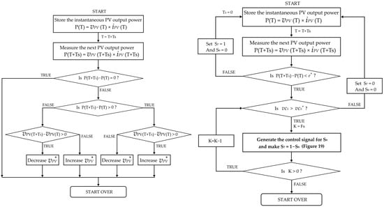 The fundamental concept of the P&O algorithm involves optimizing the operating voltage of the DC bus voltage to pinpoint the precise point at which the PV output power reaches its peak, taking into account the power extracted by the DC–AC power converter. The flow chart in Figure 18 (left) illustrates the operational process of the P&O algorithm. The scalability and performance robustness of this control type render it an efficient and appropriate option for MPPT control in many PV systems. The operational principle and in-depth analysis of the P&O algorithm are well discussed in [34].