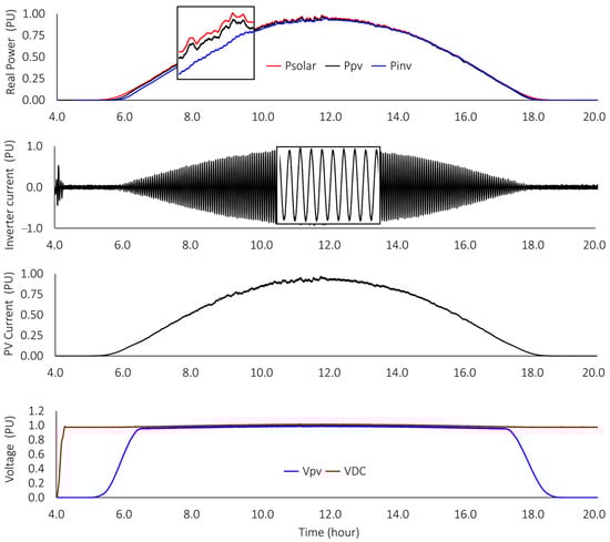 System performance evaluation with the proposed inverter under a 27% partly cloudy weather condition for the entire PV array during 22 May.