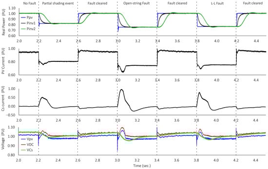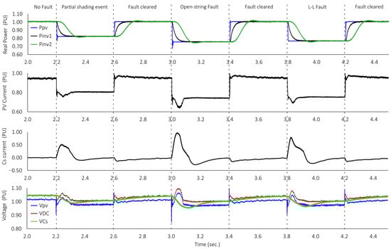 System transient performance with the proposed converter and partial shading, open-string and L–L array faults during 27 February.