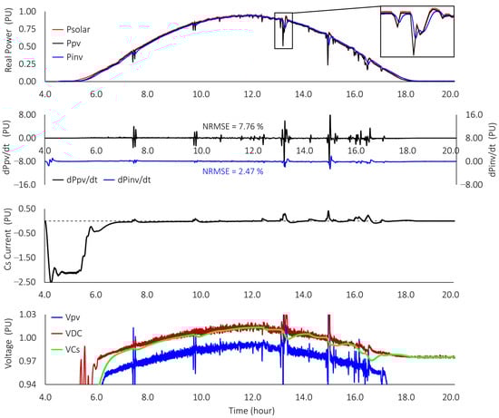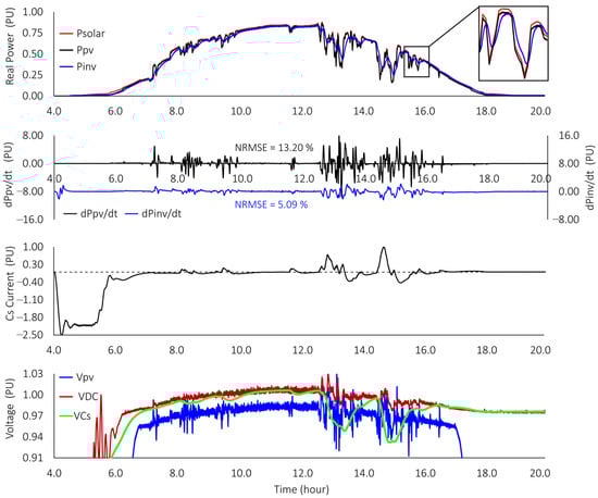 Figure 26 illustrates the system’s performance with the proposed inverter under a 6% partly cloudy condition, while Figure 27 presents the analysis under a 27% cloud level. The evaluation considered key parameters including the received solar energy, PV output power, DC bus voltage, and the output power of the DC–AC inverter, as well as the voltage and current dynamics of the compensatory capacitor CS. Also, the transient power-to-time variation (dP/dt) was evaluated for both cases in order to demonstrate the power rate of change (ROC). The results indicate that the proposed VF-qZSI effectively regulates and smooths the output power of the DC–AC inverter before its injection into the PCC bus.