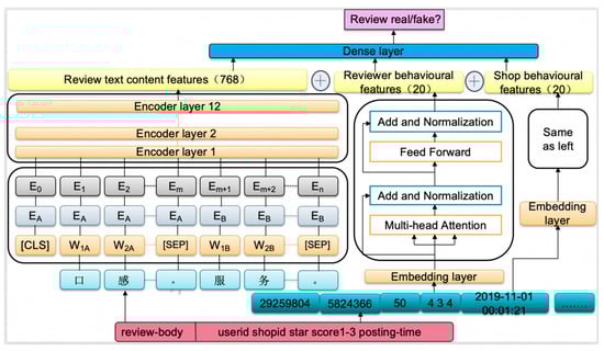 - Dense processing module: The global semantic features from the comment text processing module are combined with reviewer and reviewed merchant behavior features. These combined data are then sent to the dense module to perform text classification, labeling the comment text as either a real or fake review.