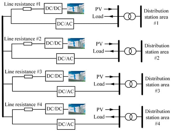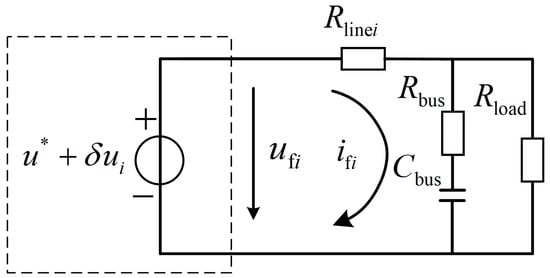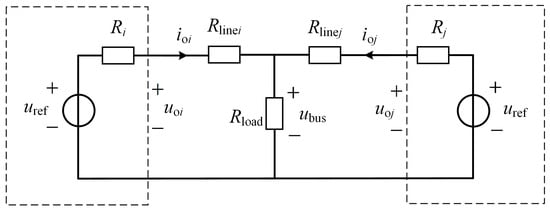 In the equalization control strategy proposed in the above study, the ideal control effect cannot be achieved without considering the effect of line impedance. Virtual impedance has been added to the control to simulate the effect of impedance on the droop control in [15], thus counteracting the effect of line impedance on load distribution and giving a better equalization effect. In [16], the line resistance is compensated to the droop control, and a communication interruption control formula is additionally set to guarantee the control effect, but its control algorithm is relatively complex. A new parameter, ‘virtual voltage drop’, is defined from the droop coefficient and line resistance in [17]; meanwhile, the DC bus voltage does not need to be used as a feedback signal. Reference [18] injects a short-time small voltage perturbation on the DC bus reference voltage and uses a closed-loop estimation algorithm to estimate the line impedance value associated with the DC/DC converter in the DC microgrid. Reference [19] proposes a dynamic droop coefficient correction control, dynamically adjusting each converter’s droop coefficient to cope with the impact of uncertain line impedance. Reference [20] proposed using a recursive least squares algorithm for online estimation of feeder resistance, eliminating the need to test the actual feeder resistance at the design stage.