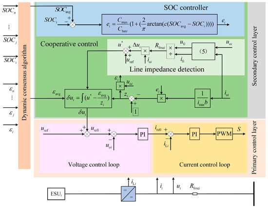 To complete the appropriate control objectives, the difference between the ESU capacity and the line impedance must be taken into account. However, the conventional droop control has a fixed droop coefficient and can only allocate power according to a fixed value, so it is not possible to adaptively adjust the droop coefficient and maintain the SOC equilibrium of the DESUs. In addition, due to the existence of line impedance, the bus voltage will deviate from the reference, which is a pair of contradictions of the droop control.