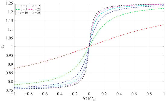 In the analysis below, two ESUs in parallel are used as an example. The converter from Equation (9) and SOCki = SOCavg − SOCi is assumed. The Arctan function and amplification factor are introduced to construct the equalization factor. Because of the large slope of the arctangent function near zero, its value increases faster near zero, and the equalization factor can be limited to a certain range. This characteristic of the arctan function is used to design the amplification factor, as shown in Figure 5. When the amplification factor c is increased, the convergence speed and precision of information state factors are guaranteed, so c = 25 is selected.
