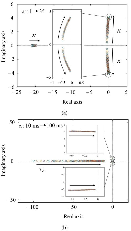 Figure 7a,b display the pole distribution for k from 1 to 35 and τe from 10 ms to 100 ms. From Figure 7a, when the value of k increases, the poles are all on the left side of the imaginary axis and move to the right, but the system can remain stable within the maximum range of k. As can be seen from Figure 7b, the poles are located to the left of the imaginary axis and move to the right as the τe increases. The increase in τe can ensure the system’s stability.