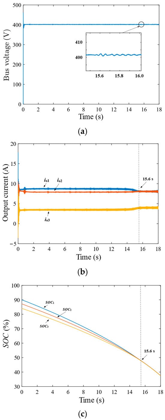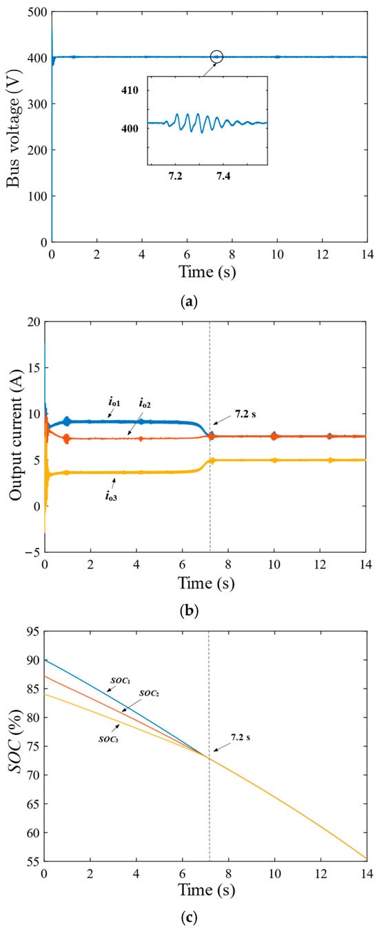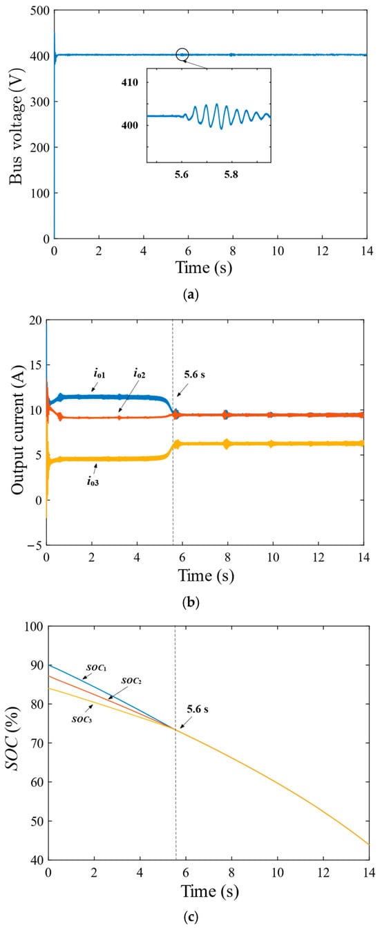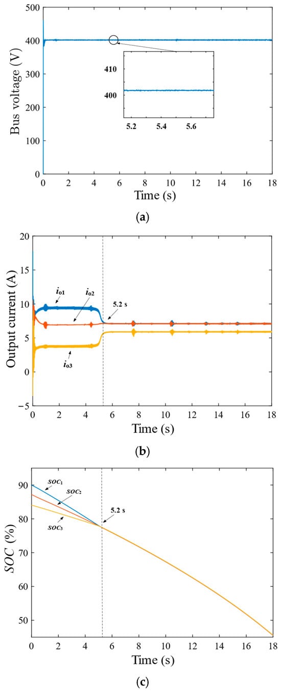 The ESU is regular discharge before the load is incorporated, and a 60 Ω resistive load is incorporated into the load when t = 4.2 s. From Figure 18a, the bus voltage can be restored to the reference value of 400 V after a fluctuation of 0.02 s. From Figure 18b, because a 60 Ω resistive load is incorporated after 4.2 s, the output current increases. The increase in power of the load leads to an increase in output current. At t = 7.9 s, the output currents are 10 A, 10 A, and 6.6 A, respectively, which satisfy the output current distribution by capacity. After adopting the proposed strategies, the difference between different SOCs continues to decrease, and in the end, the SOC reaches equilibrium at t = 7.9 s, as shown in Figure 18c.