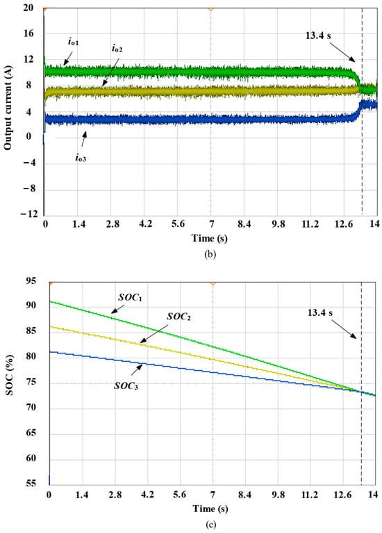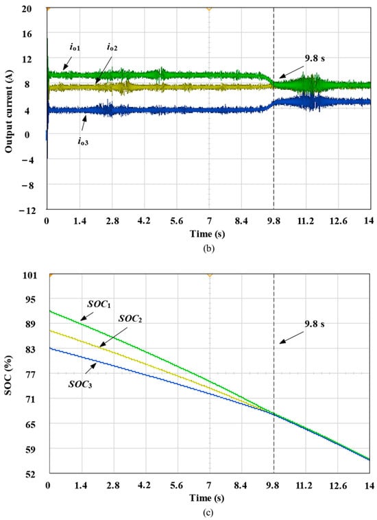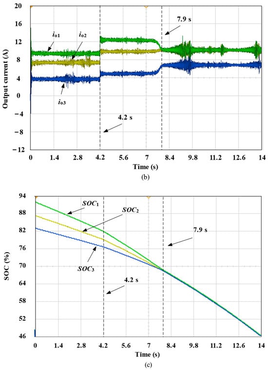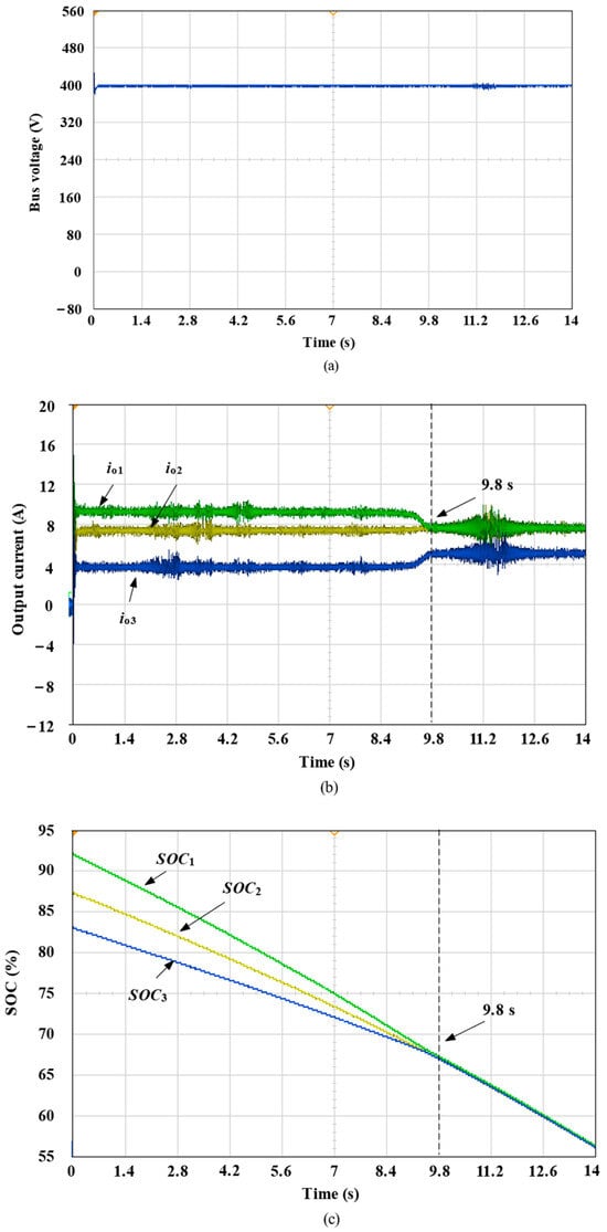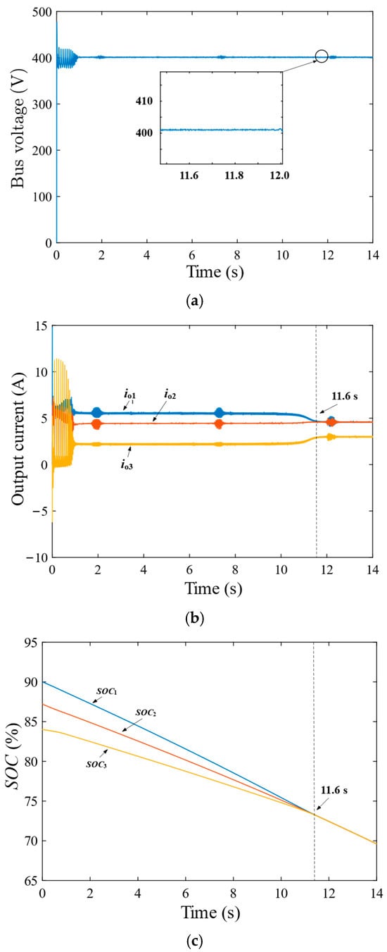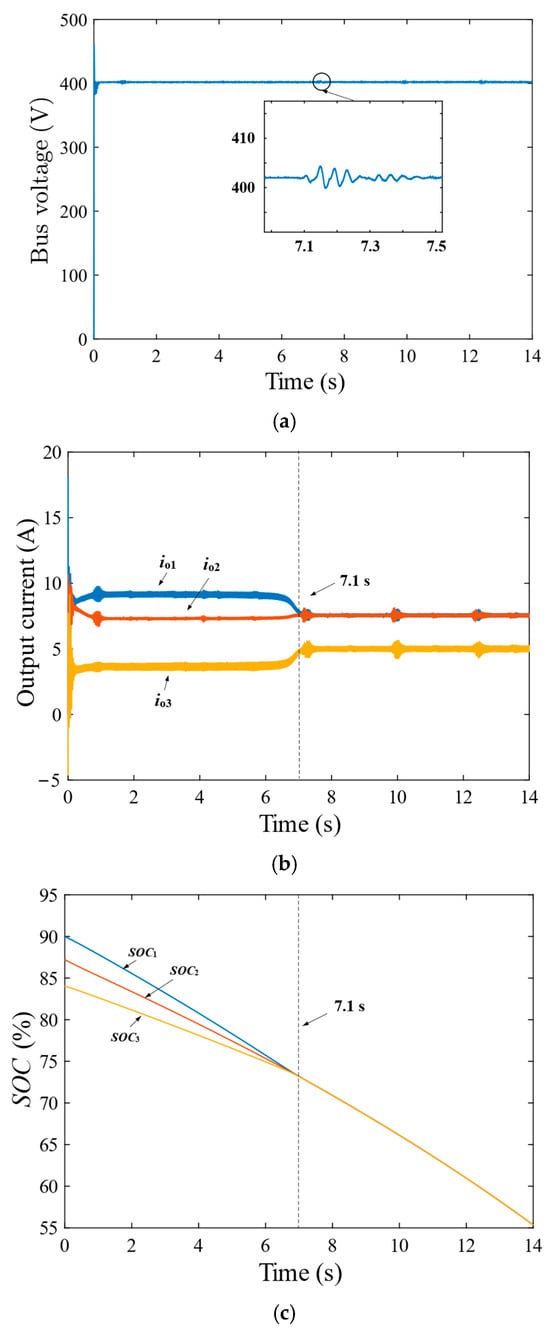 The ESU is regular discharge before the load is incorporated, and a 60 Ω resistive load is incorporated into the load when t = 4.2 s. From Figure 18a, the bus voltage can be restored to the reference value of 400 V after a fluctuation of 0.02 s. From Figure 18b, because a 60 Ω resistive load is incorporated after 4.2 s, the output current increases. The increase in power of the load leads to an increase in output current. At t = 7.9 s, the output currents are 10 A, 10 A, and 6.6 A, respectively, which satisfy the output current distribution by capacity. After adopting the proposed strategies, the difference between different SOCs continues to decrease, and in the end, the SOC reaches equilibrium at t = 7.9 s, as shown in Figure 18c.