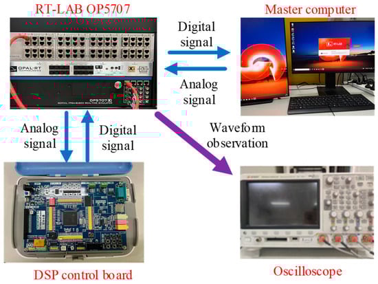 To verify the effectiveness of the proposed strategy, a hardware-in-the-loop experimental platform is established based on an RT-Lab real-time platform combined with a DSP control board for experimental verification, as shown in Figure 14. The experimental platform is equipped with a master computer, oscilloscope, OP5707, and DSP. In this case, the main circuit model is built in the RT-Lab system. The control strategy is implemented on the DSP board. The key parameters are shown in Table 1.