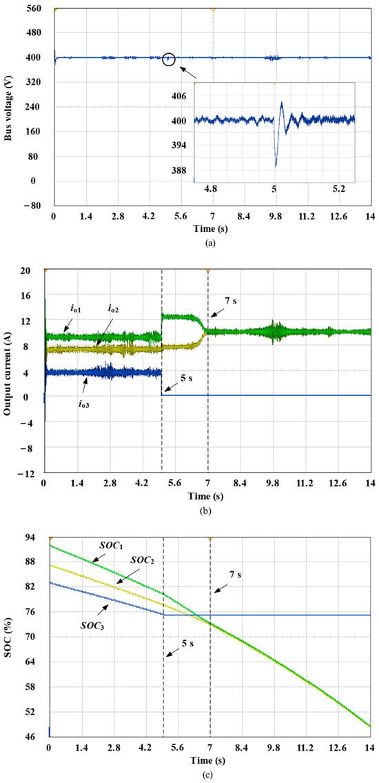 Experiment of [25]. (a) DC bus voltage. (b) Output current. (c) SOC.
