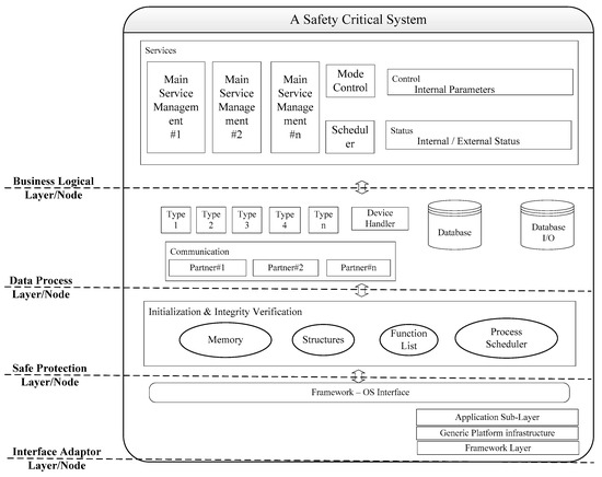 Based on actual business requirements, we transform a typical safety-critical system into an abstracted, hierarchical architecture of computing units. According to the functional deployment, a typical safety-critical system is composed of business logic units, safety protection logic units, data storage units, and external interface adaptors, as shown in Figure 1.
