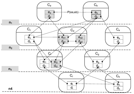 Therefore, the architecture in Figure 2 consists of 4 nodes, including 9 computing units, 11 components, and 19 data flow paths. Meanwhile, we can define the starting point of the data flow as the parent component and the ending point as the child component. For example, component in Figure 2 is the parent component of the component set , and component is a child component of the component set .