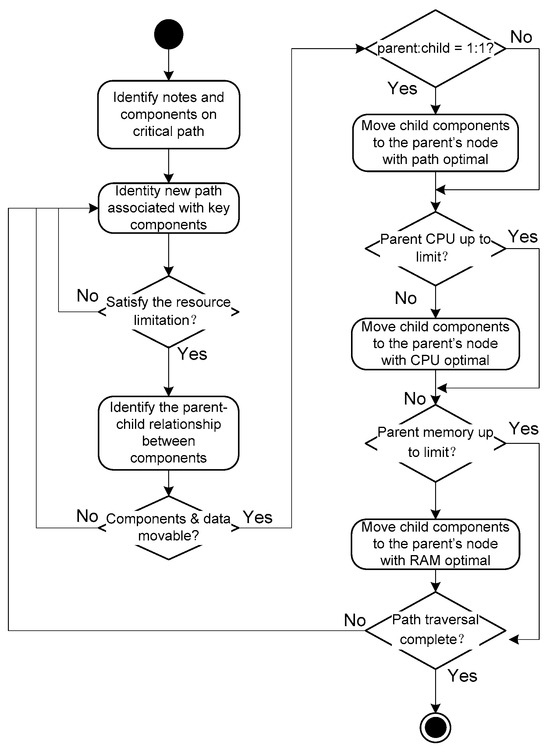 Step 1: According to sub-equation in Equation (8), check the resource utilization rate of the node: If the resource constraints are not reached, migrate the components (with their data) from non-critical path to the parent components which located on the critical path (see Definition 2 for children-parent component);
