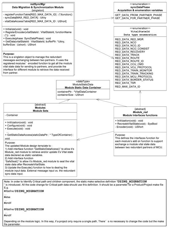 In Figure 6, the data migration and synchronization module (i.e., redSyncMgr) in the software implementation is the main processor responsible for the entire migration algorithm. It is mainly used to traverse the data ID in the ModuleStaticData container to call the corresponding data processing module and compares it with the predefined VitalStateID to determine whether the current component and data belong to a data class or a logical class. Finally, according to the component interface function (i.e., Module_red), it moves the components according to the data migration strategy in the mode of “Type Copy” (i.e., applicable to nodes on different physical platforms) [25] or “Type Reference” (i.e., applicable to nodes on the same physical platform) [40].
